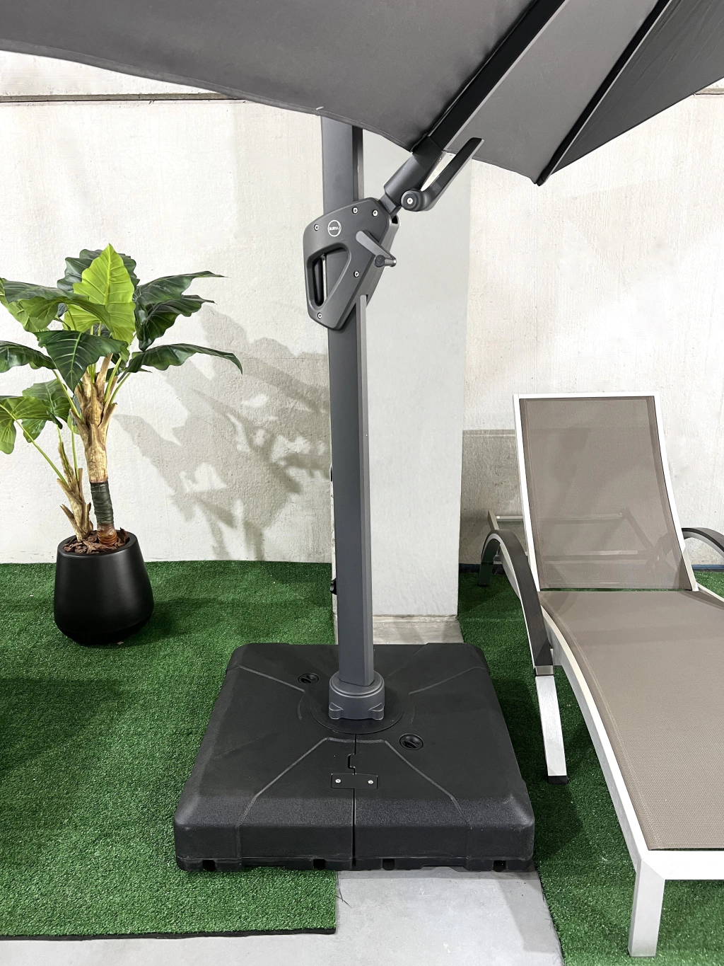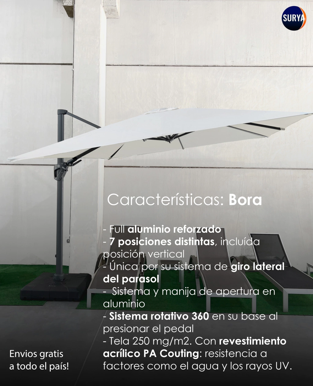 Sombrilla Surya Bora cuadrada 3x3mts con sistema de giro lateral del parasol. Base plástica 100 lts. con 4 ruedas y funda impermeable.